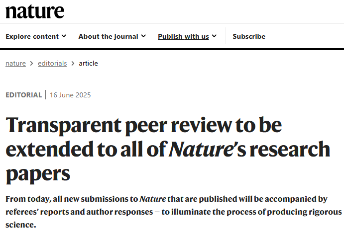 自2020年起,Nature 期刊已为作者提供将同行评审文件与论文同步发表的选择。其姊妹刊Nature Communications自2016年起便实施此政策。此前,Nature作者可自愿选择加入透明同行评审流程。但自2025年6月16日起,所有以研究论文形式发表于 Nature 的新投稿,将自动附带审稿人报告与作者回复的链接。