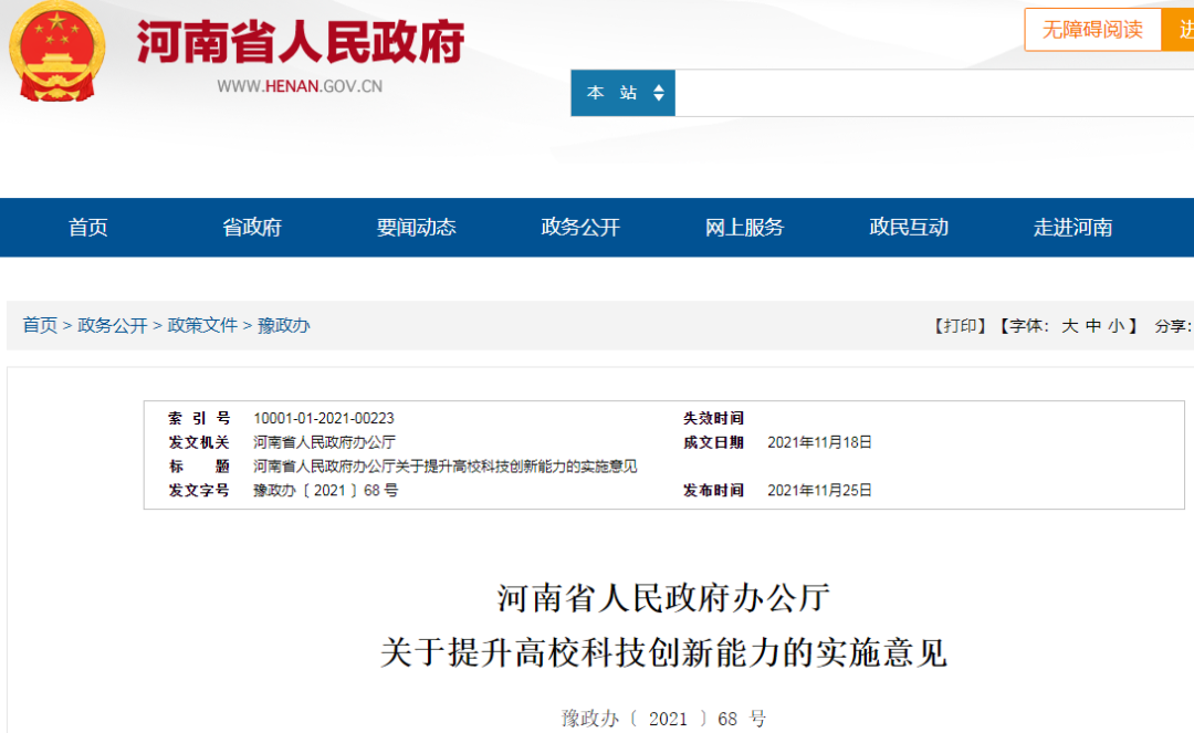 《河南省人民政府办公厅关于提升高校科技创新能力的实施意见》发布于2021年11月25日,是河南省主要领导赴京归来的第二天。